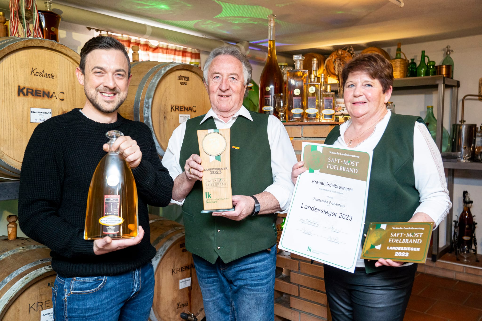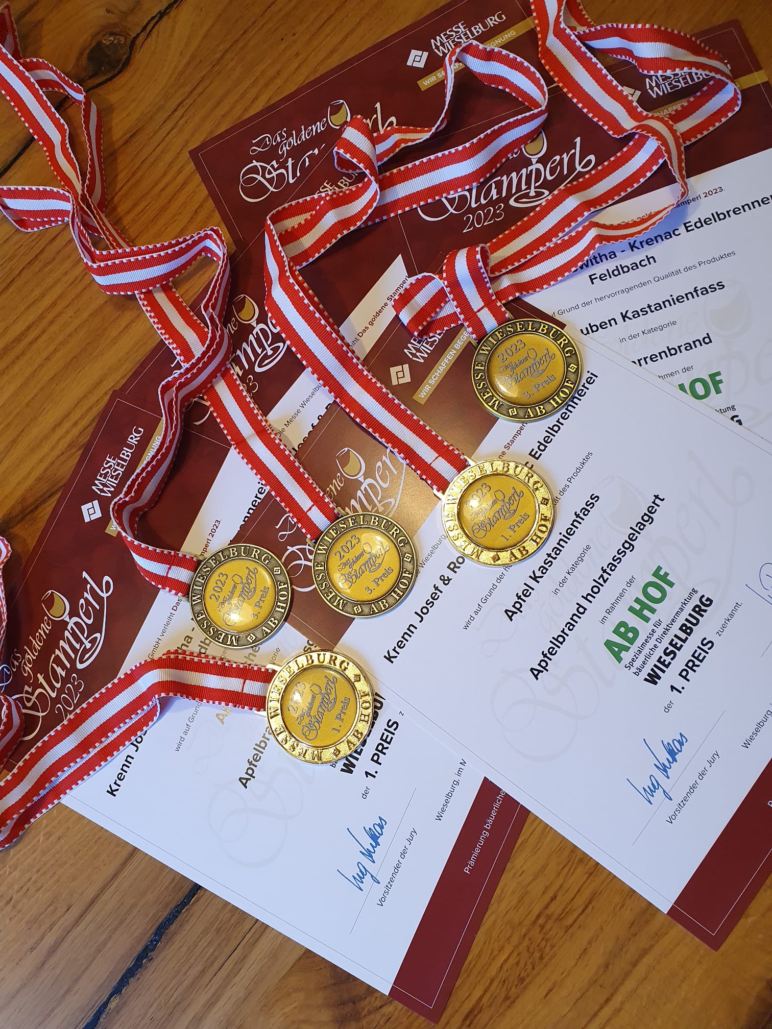 Goldmedaille fr Traubenbrand im Kastanienholzfass